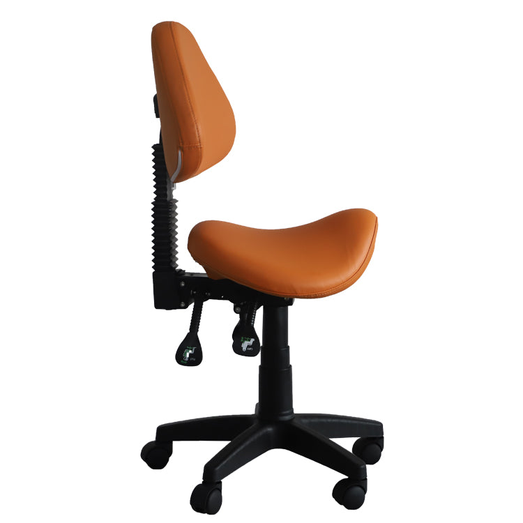 Three-way adjustable saddle stool with backrest. Reinforced nylon wheel casters for extra stability and easy-rolling on even surfaces. High density and high resilience molded foam seating cushion coated with premier 100% PU leather, which is water & oil proof, abrasion-resistant, easy to clean. Perfect for a dentist, dental hygienists, dental operators, medical surgeon, guitar player, tattoo artist, hairstylist, sewing machine operator, home office professional, student, physiotherapist, massage therapist, computer operator, and anyone who works in a seated position.